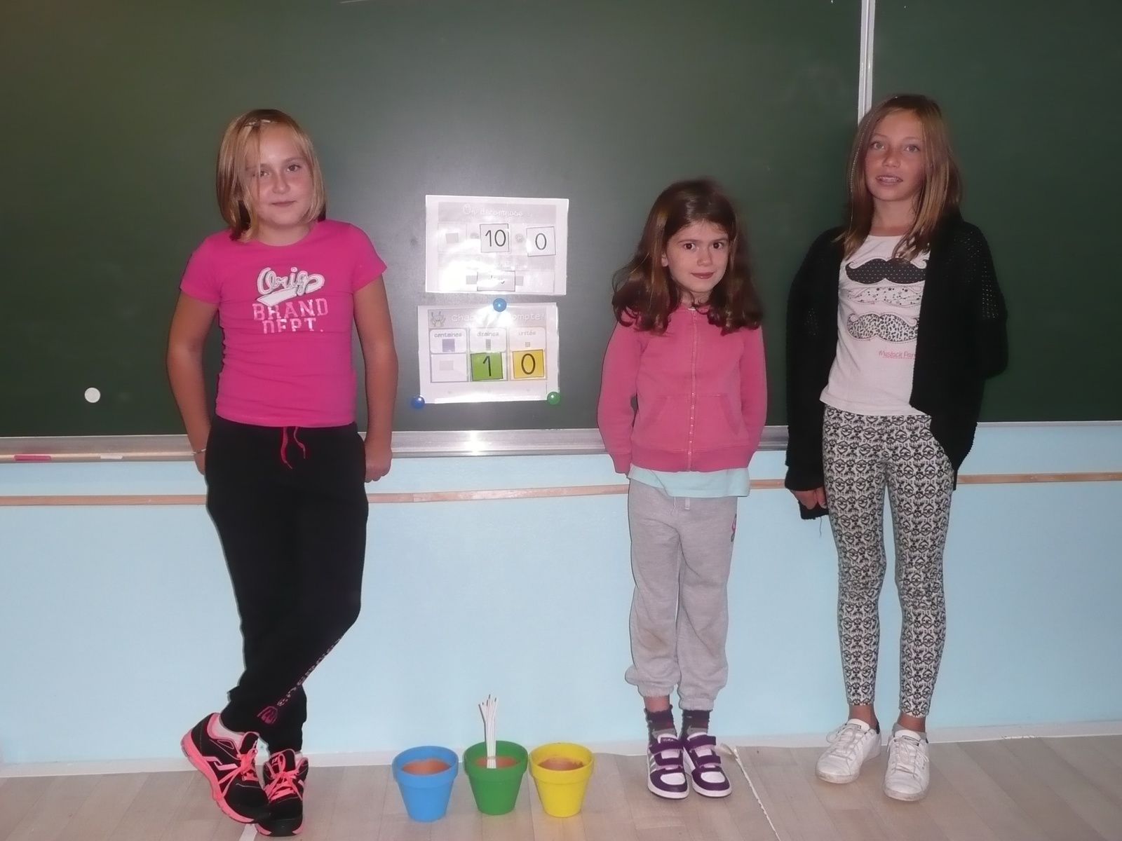 Les élèves doivent mettre des pailles dans les bons pots pour matérialiser les jours d'école passés. Et au bout du 100ème jour d'école, on fait la fête autour du mot "cent" en réalisant des énigmes mathématiques et d'autres jeux autour du mot cent.