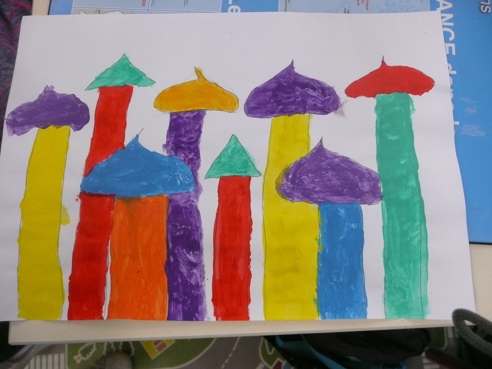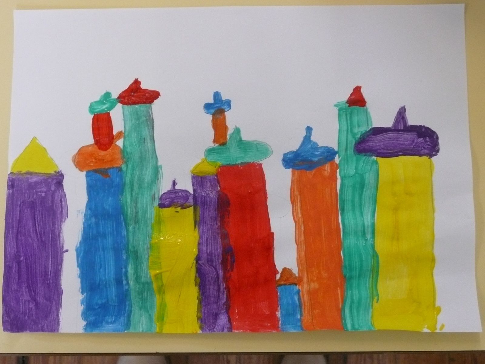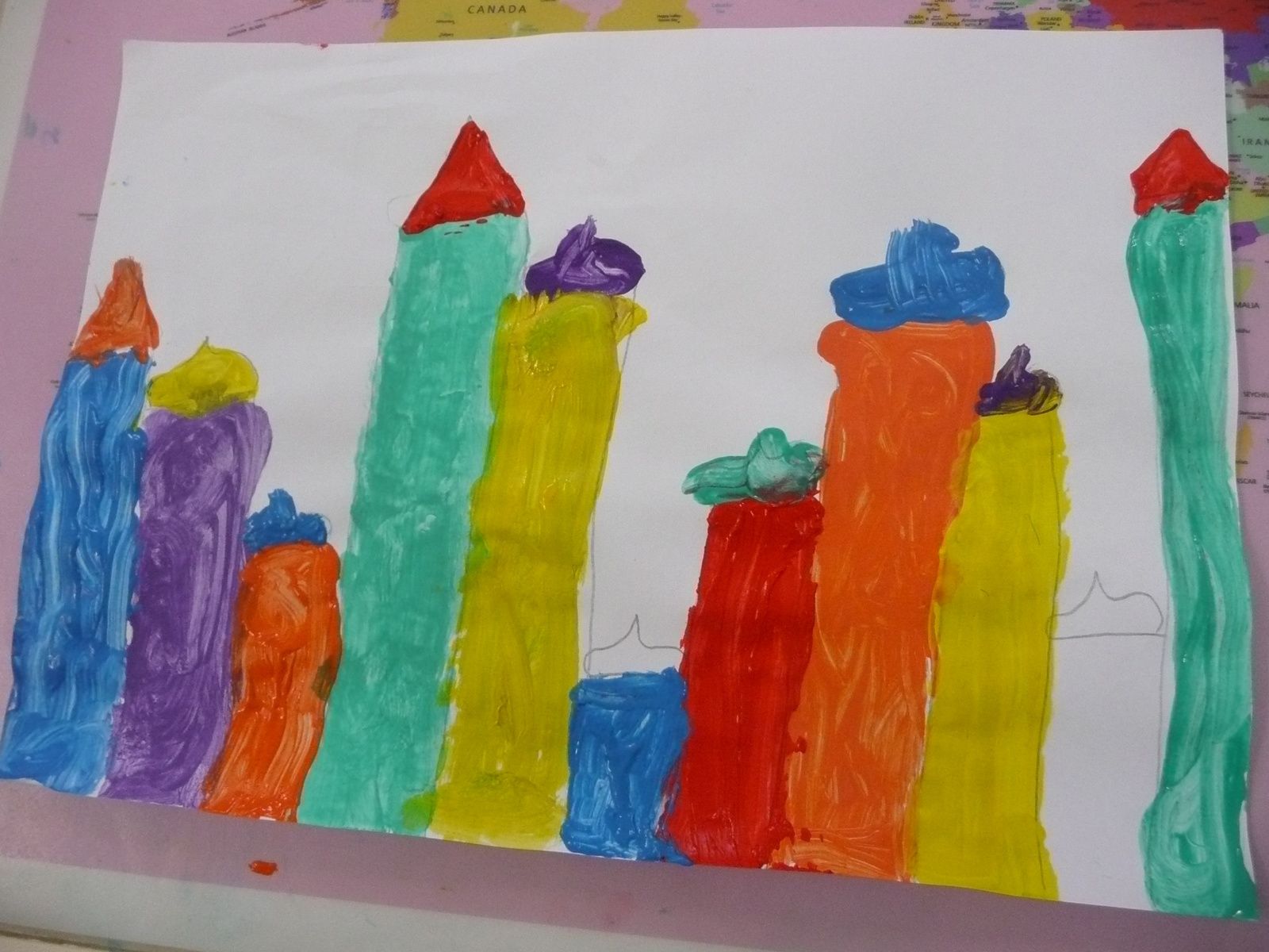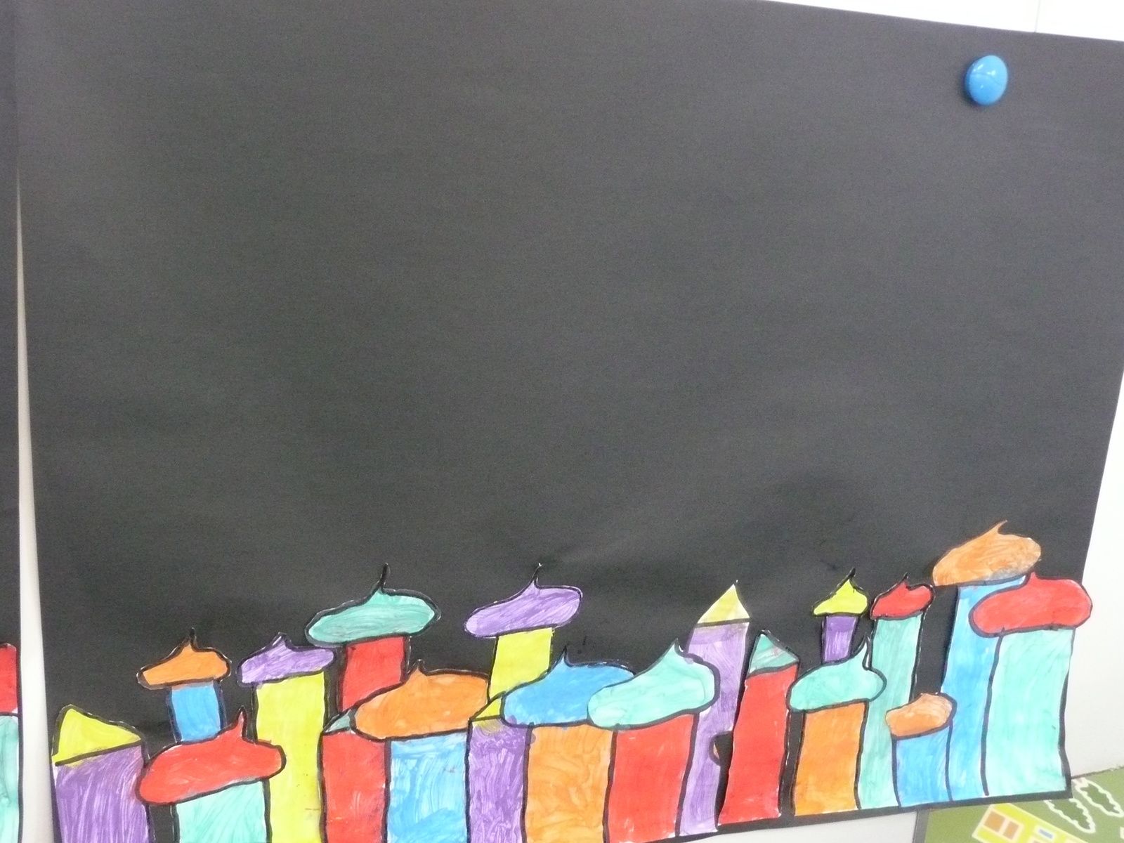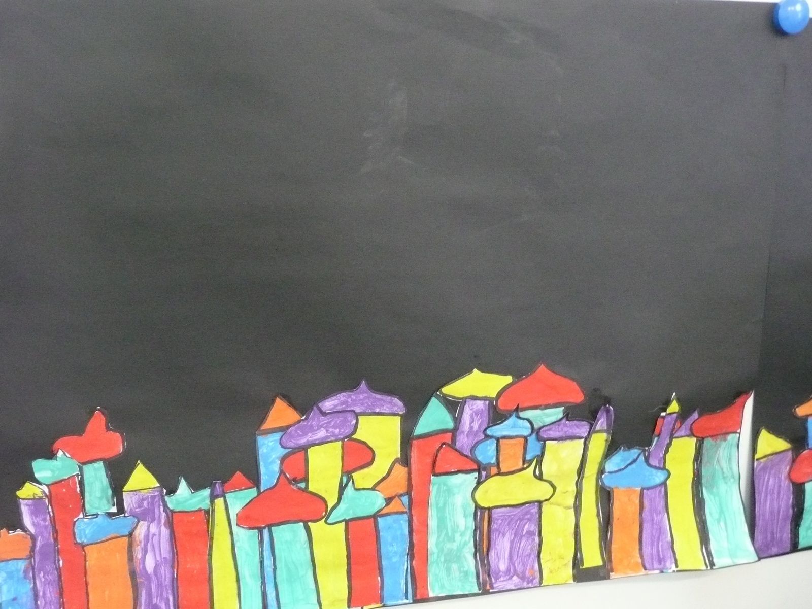Les élèves ont ensuite dessiné et peint des maisons pour enfin les rassembler et réaliser collectivement un village sur un fond noir.